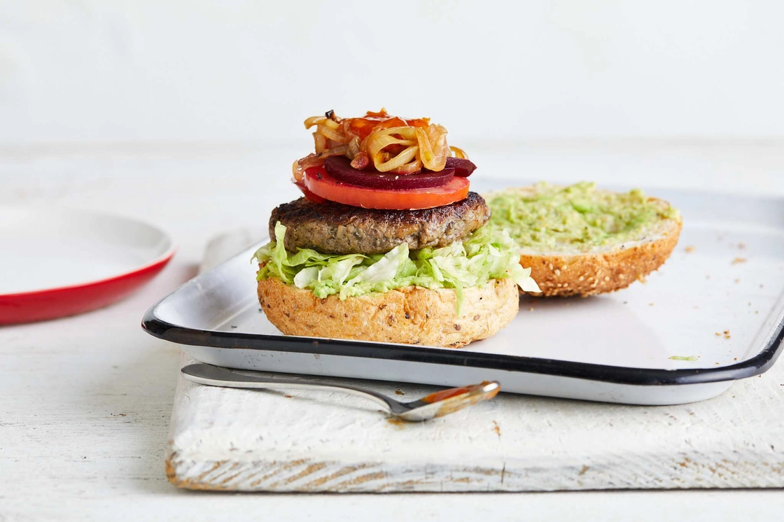 Split rolls in half and toast lightly. Spread avocado over cut-sides of rolls. Top bases with lettuce, patties, tomato, beetroot, onion and chutney. Cover with roll tops to serve.