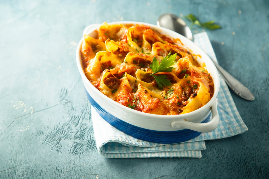 Serve bolognese pasta bake with pumpkin salad and breadrolls.