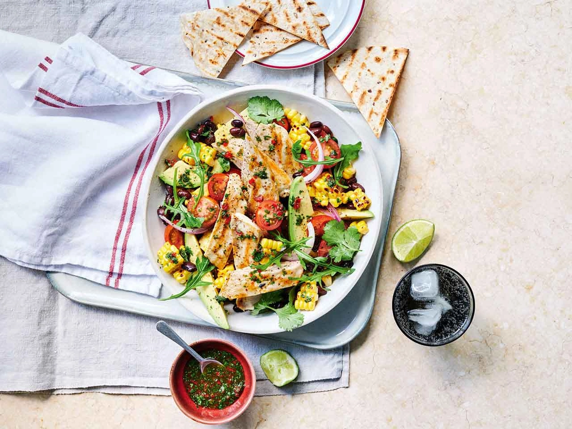 Arrange corn, black beans, tomato, onion, avocado and rocket in a large serving bowl. Add chicken and drizzle with dressing. Serve with wraps and season with pepper.