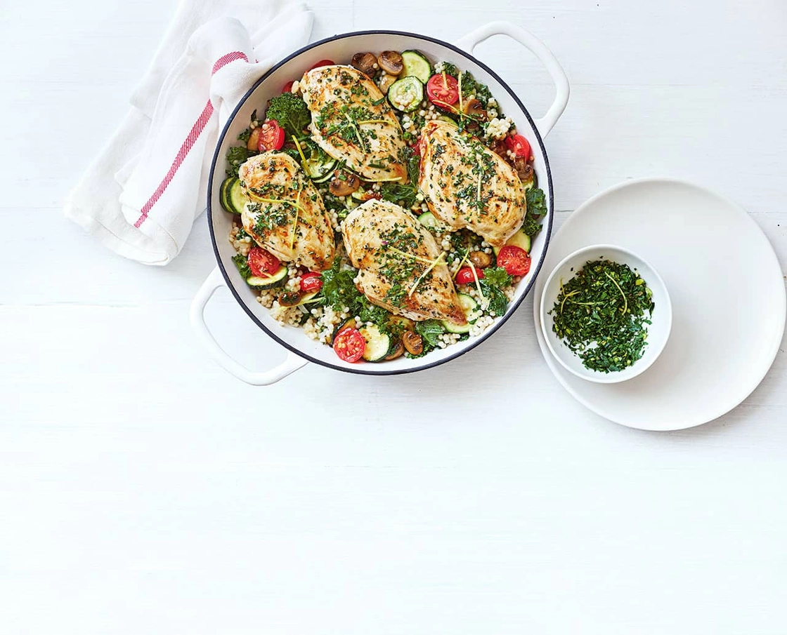 Stir in the tomato and kale. Arrange the chicken over the kale mixture. Cook, covered, for 5 minutes or until the couscous is tender and the chicken is cooked through.